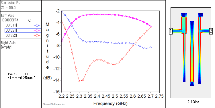 ヘアピンを狭くすると広帯域になって2401付近も上がり、空Sも大きくなりました。