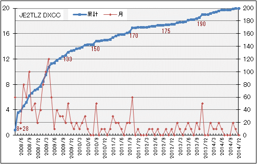 下はDXCC200までを月ごとに集計したグラフです。